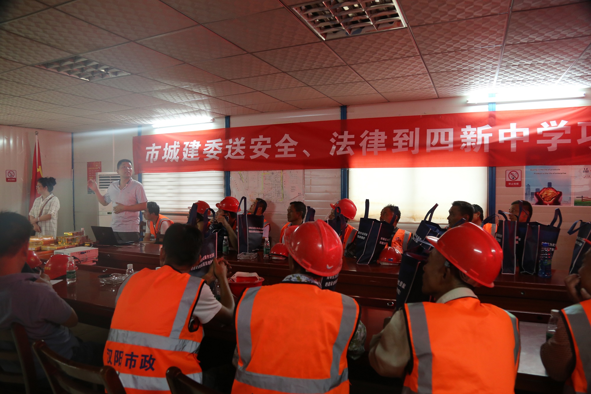 當(dāng)天下午,武漢四新中學(xué)建設(shè)項目再次迎來一批客人,武漢市城建委邀請建筑安全、法律專業(yè)講師來到項目農(nóng)民工業(yè)余學(xué)校,集中對40余名工友進行了安全及法律培訓(xùn),并為辛苦一天的工友送上慰問品一份。培訓(xùn)中采取“講述+互動”的形式,廣大工友爭相回答培訓(xùn)中提出的相關(guān)問題,現(xiàn)場掌聲不斷,氣氛活躍,民工參與度極高,整場培訓(xùn)充分展現(xiàn)了公司對農(nóng)民工教育的優(yōu)異成果,也進一步提升了廣大工友的安全法律意識。