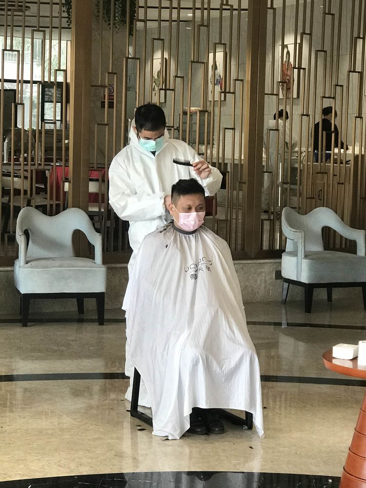 “麻煩幫我剪短點(diǎn),再剪短點(diǎn),兩個(gè)月沒理過發(fā)了,頭發(fā)從來沒這么長(zhǎng)過!”38日上午10點(diǎn),搬來幾張椅子、拿上幾把剪發(fā)器,“臨時(shí)理發(fā)店”在紐賓凱酒店大堂正式開業(yè)。