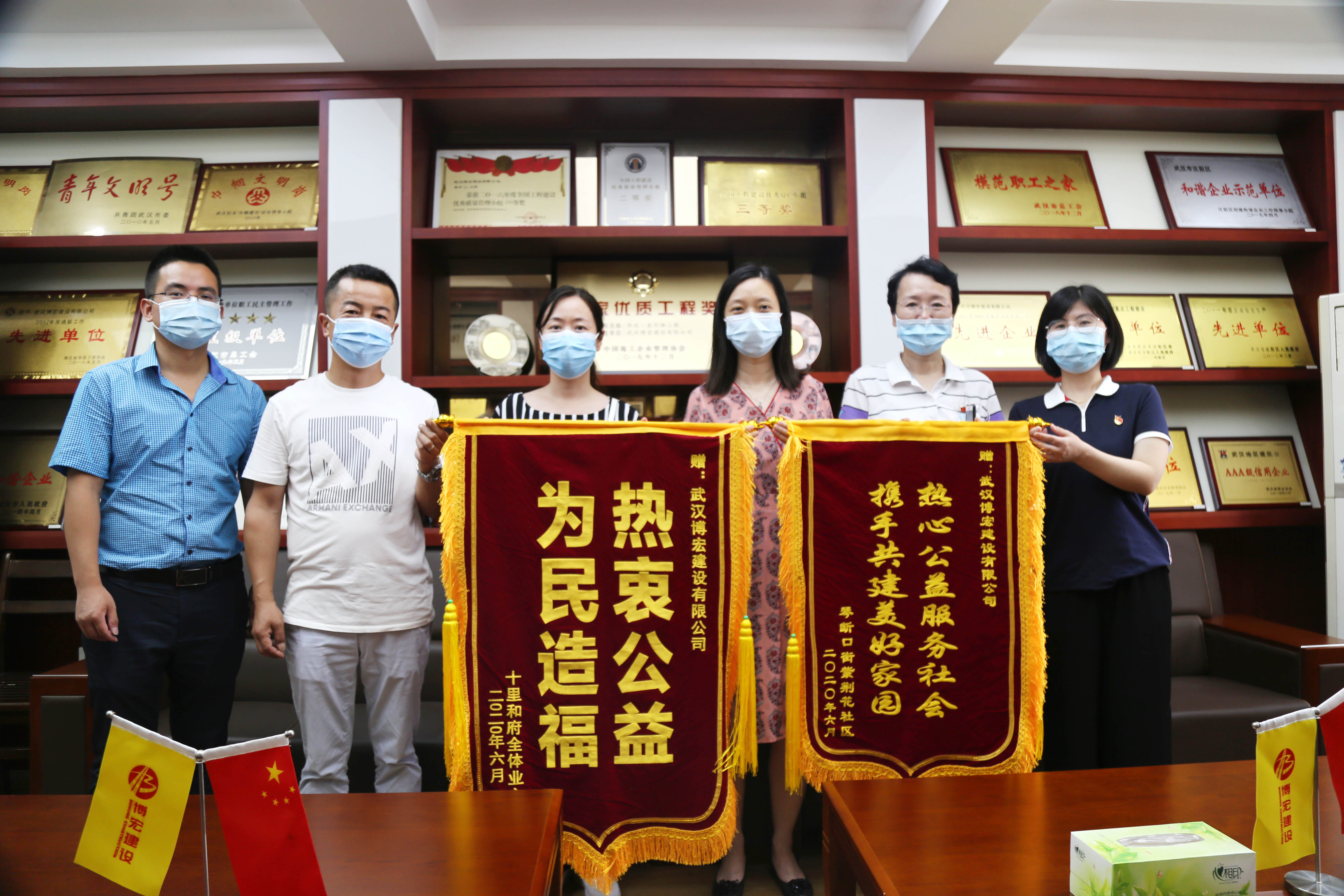 ?? 6月9日上午,漢陽區(qū)委宣傳部代表和漢陽區(qū)紫荊花社區(qū)、十里和府小區(qū)物業(yè)代表結(jié)伴而來,為博宏建設(shè)送來兩面錦旗,感謝博宏建設(shè)在改善社區(qū)工作環(huán)境,服務(wù)社區(qū)公益事業(yè)中做出的努力。據(jù)悉,十里和府小區(qū)一號樓一樓裝修老舊,地面不平,居民出行不便,博宏建設(shè)裝飾裝修項目部在周邊施工時,接到相關(guān)指示,先后派出6人歷時6天,一并對該區(qū)域近300平米進行了地磚更換,裝修效果得到了居民和社區(qū)的高度認可。