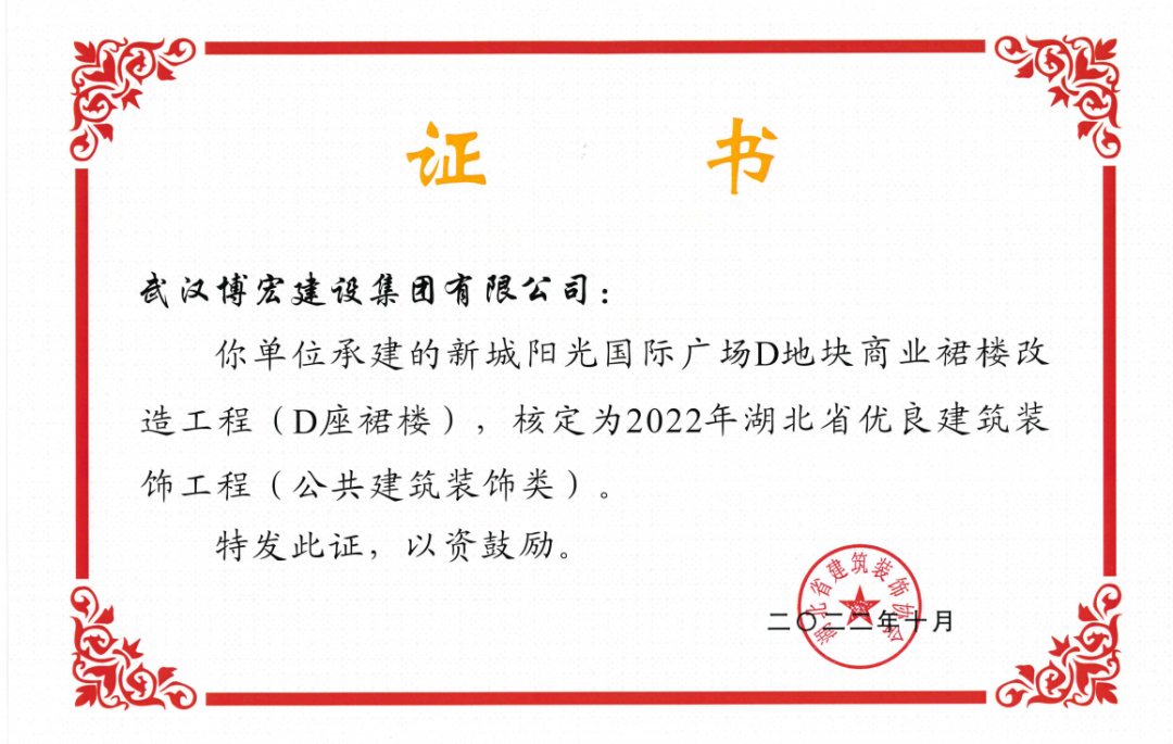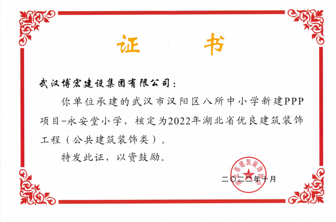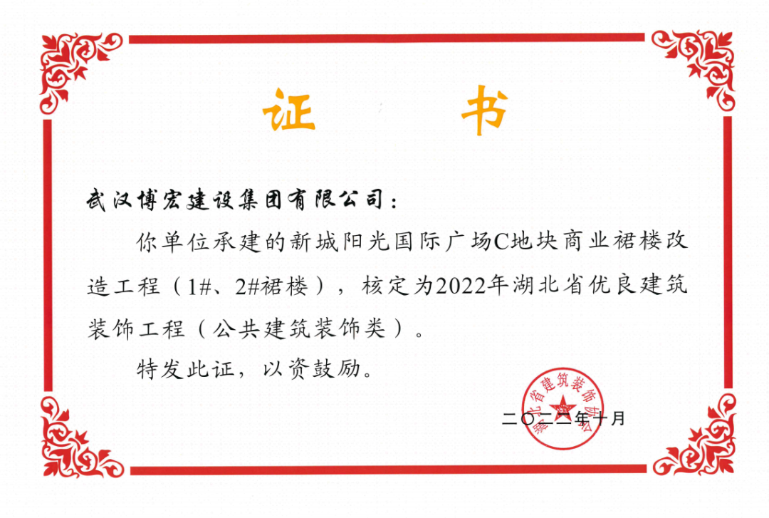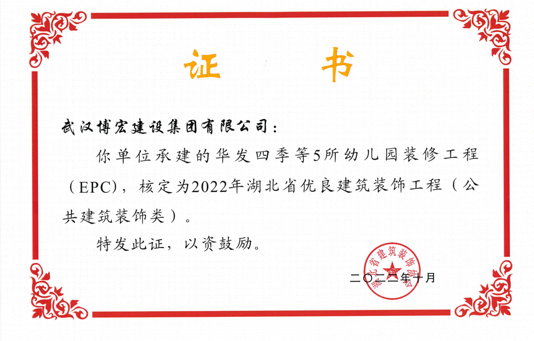 近日,湖北省建筑裝飾協(xié)會(huì)發(fā)布了《關(guān)于開(kāi)展2022年湖北省建筑裝飾工程質(zhì)量目標(biāo)考核工作的通知》,由博宏建設(shè)集團(tuán)承建的華發(fā)四季等5所幼兒園裝修工程(EPC)、新城陽(yáng)光國(guó)際廣場(chǎng)C地塊商業(yè)裙樓改造工程(1#、2#裙樓)、新城陽(yáng)光國(guó)際廣場(chǎng)D地塊商業(yè)裙樓改造工程(D座裙樓)、武漢市漢陽(yáng)區(qū)八所中小學(xué)新建PPP項(xiàng)目-永安堂小學(xué)被核定為“2022年湖北省優(yōu)良建筑裝飾工程(公共建筑裝飾類)”。