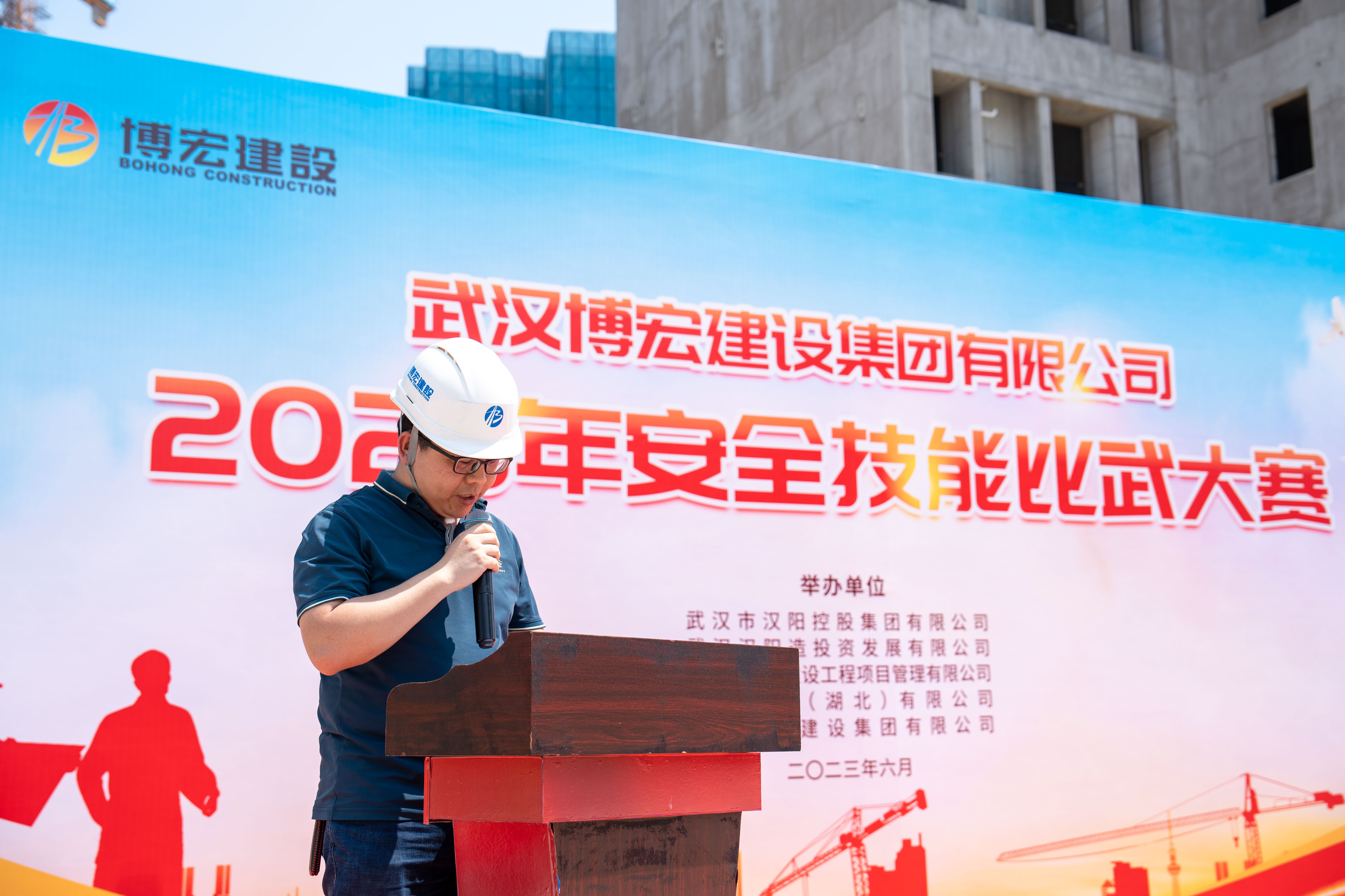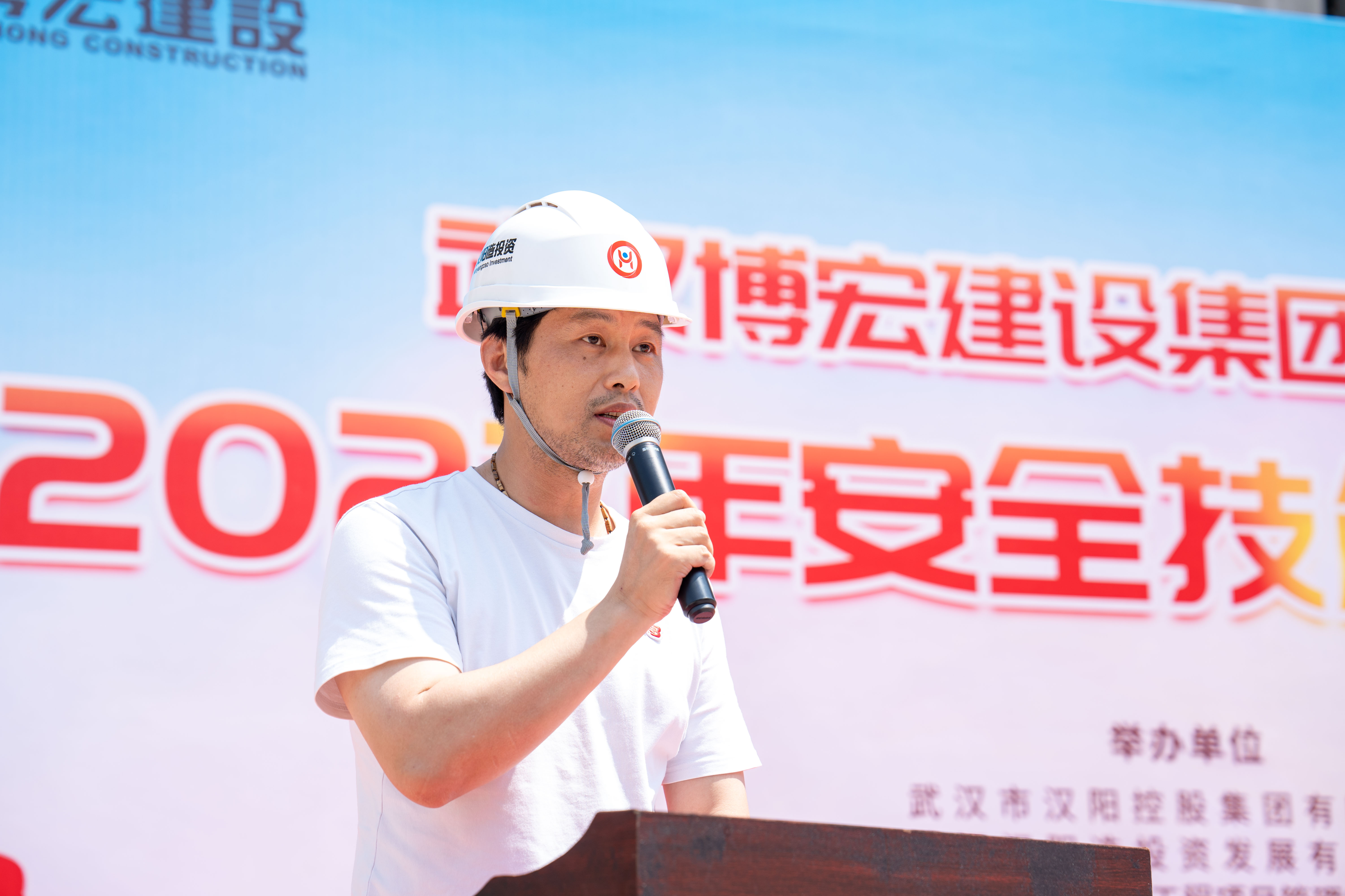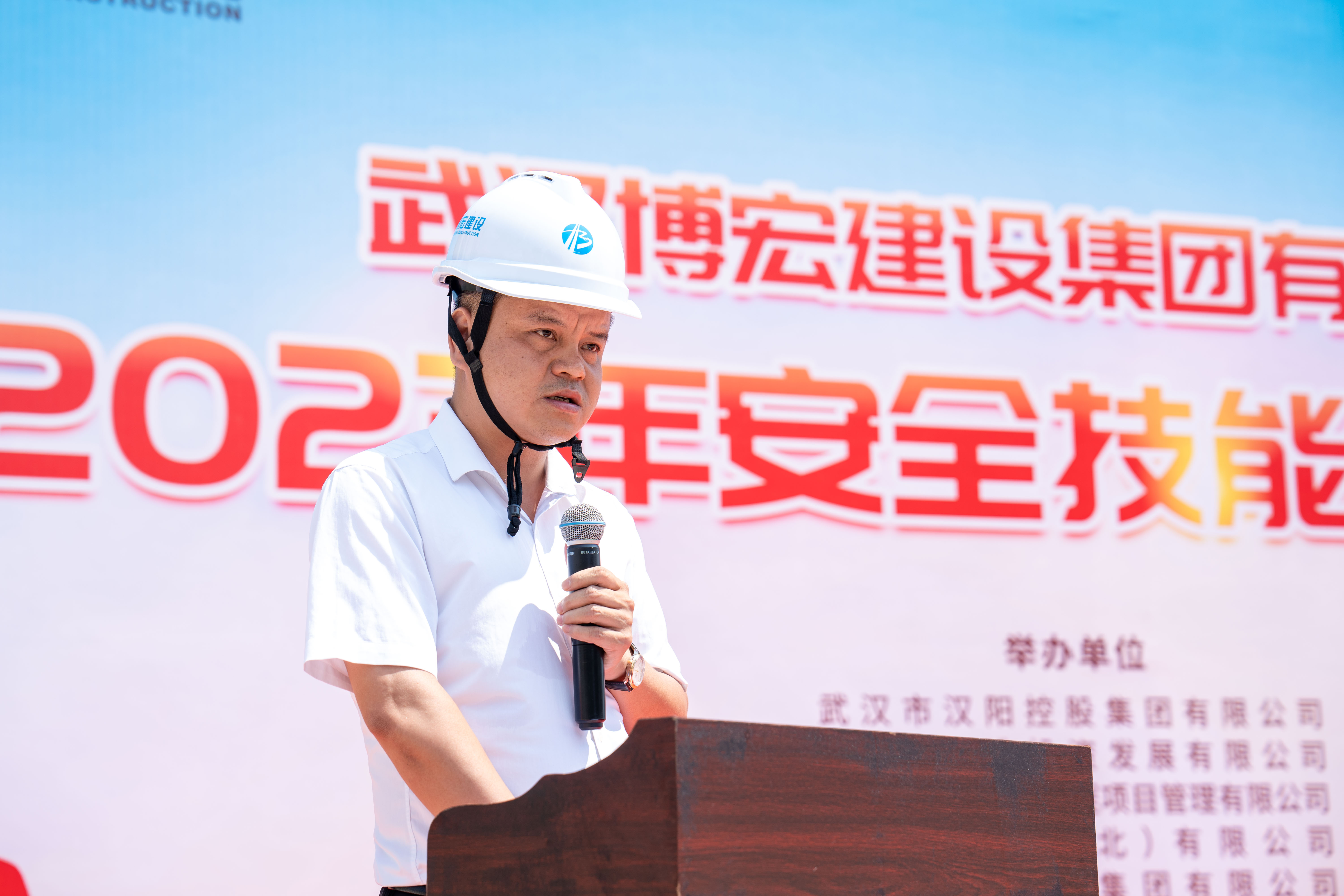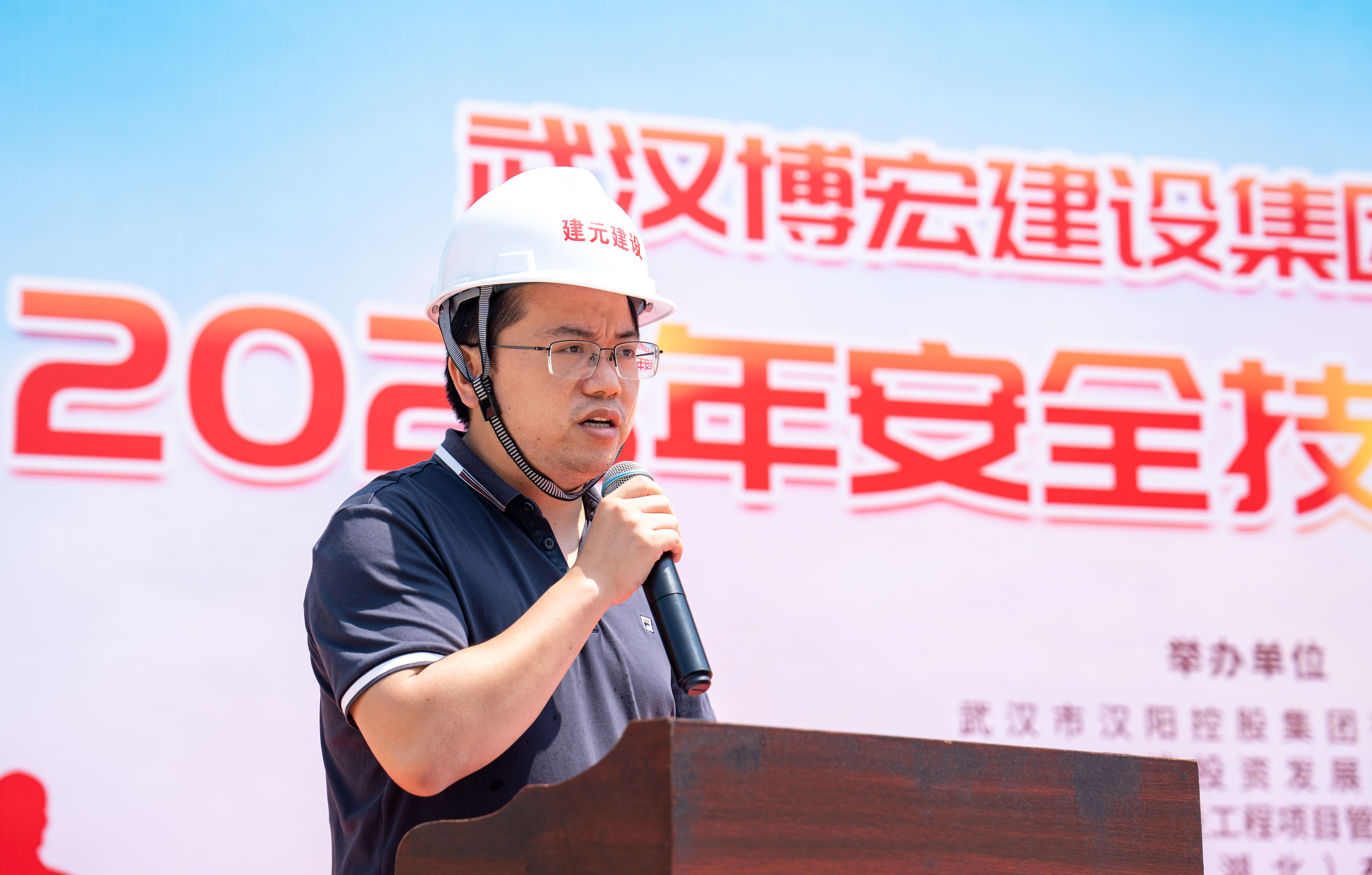 現(xiàn)場,武漢漢陽造投資發(fā)展有限公司工程部部長呂飛翔、武漢市建元建設工程項目管理有限公司房建部副部長劉志勇分別作出致辭及講話,表達了對本次大賽的希冀與祝福,號召參建各方攜手共進、合作共贏,認清安全管理的嚴峻形勢,振奮精神、自我加壓,消除安全漏洞,抓好安全工作,守好安全底線,開創(chuàng)項目安全管控新局面。