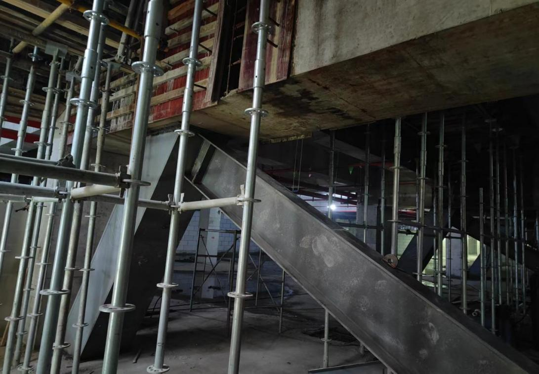 上述人字撐材料為項(xiàng)目副樓東側(cè)拆除懸挑鋼平臺(tái)的鋼構(gòu)件進(jìn)行回收利用。施工時(shí)支撐系統(tǒng)搭拆快捷,節(jié)省了人工、鋼管扣件及架體租賃費(fèi)用,有效縮短了工期。該支撐系統(tǒng)具有整體剛度大、穩(wěn)定性好、節(jié)點(diǎn)牢固的特點(diǎn),無論是安裝、拆除都十分方便,靈活性較強(qiáng),極大程度地保證了現(xiàn)場的施工安全。且待結(jié)構(gòu)完成后,人字撐支撐材料可拆卸回收周轉(zhuǎn)利用,創(chuàng)造了良好的環(huán)保、經(jīng)濟(jì)和社會(huì)效益。